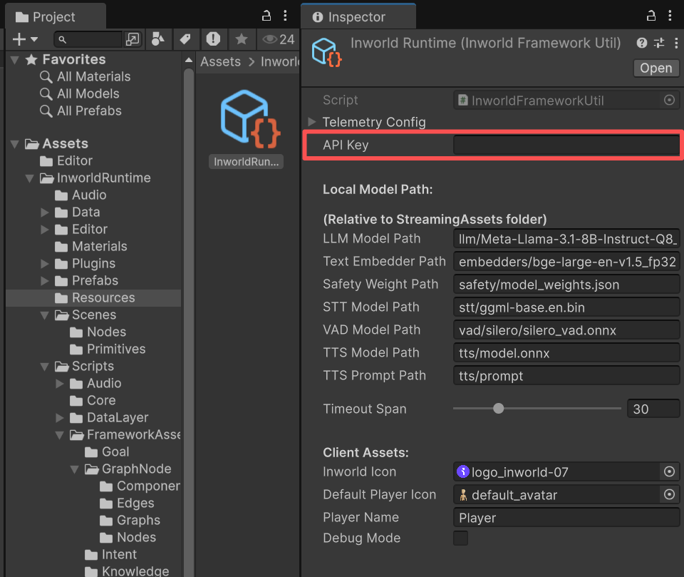 To use the Inworld Runtime SDK with the cloud APIs, go to Assets/InworldRuntime/Resources.In the Inspector, add your Base64-encoded Runtime API key.