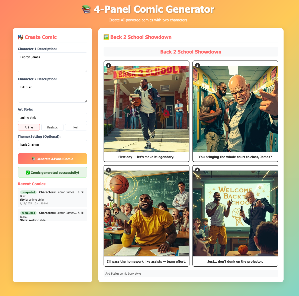 Click “Generate Comic” and wait for the processing to complete. You can check the status or view recent comics through the interface.