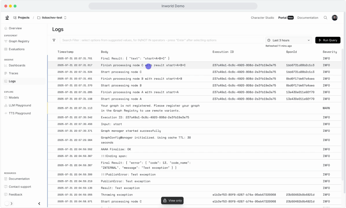 If telemetry is configured, logs are automatically generated by the Inworld runtime during graph execution and sent to Portal.Support for capturing your own custom logs in Portal is coming soon.