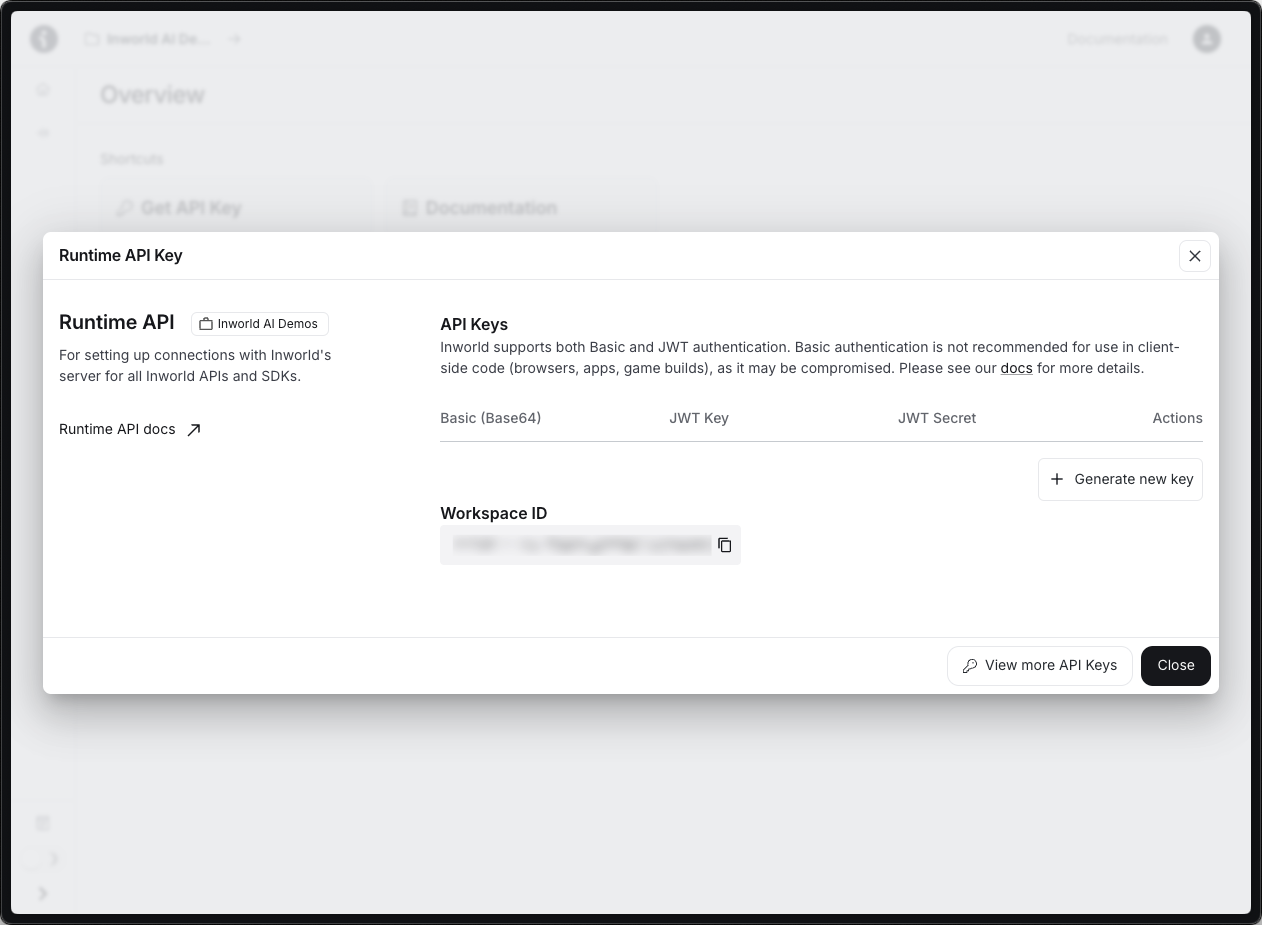 Create an Inworld account.In Inworld Portal, generate a Runtime API key, by clicking the Get API Key shortcut in the Overview tab, or going to Settings > API Keys. Copy the Base64 credentials.