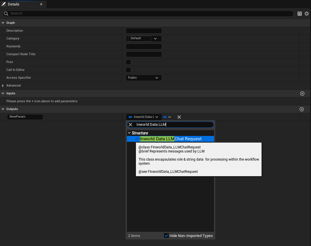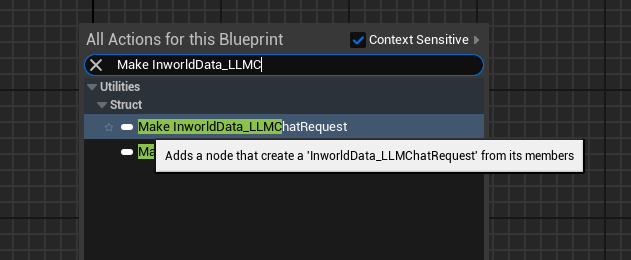 Right click in the function blueprint and search for “Make InworldData_LLMChatRequest”. Select it.