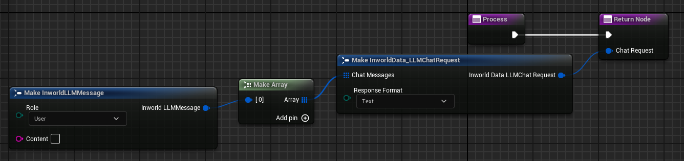 - Drag the output of the Make InworldData_LLMChatRequest node to the return node of the function.