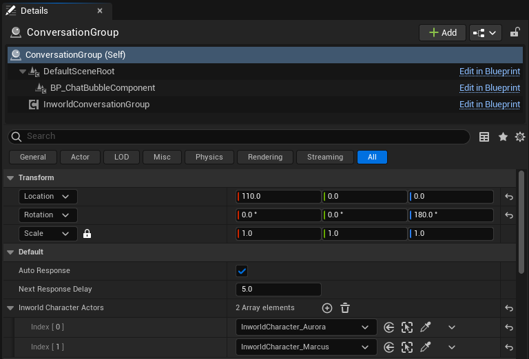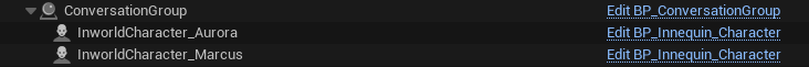 In the MultiCharacter level, the conversation group is created by a BP_ConversationGroup actor (a blueprint from the Character template).