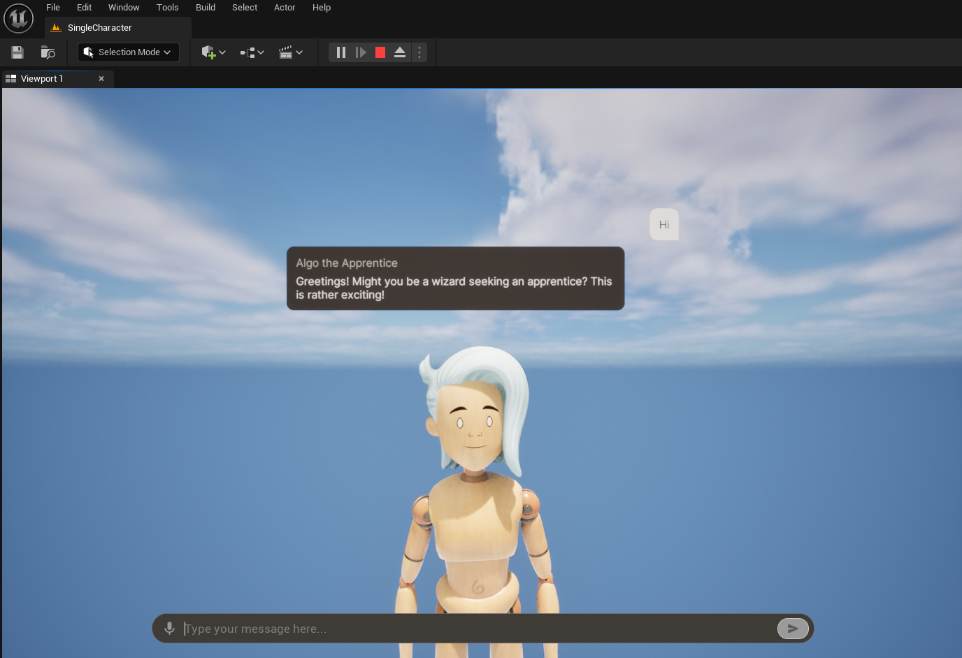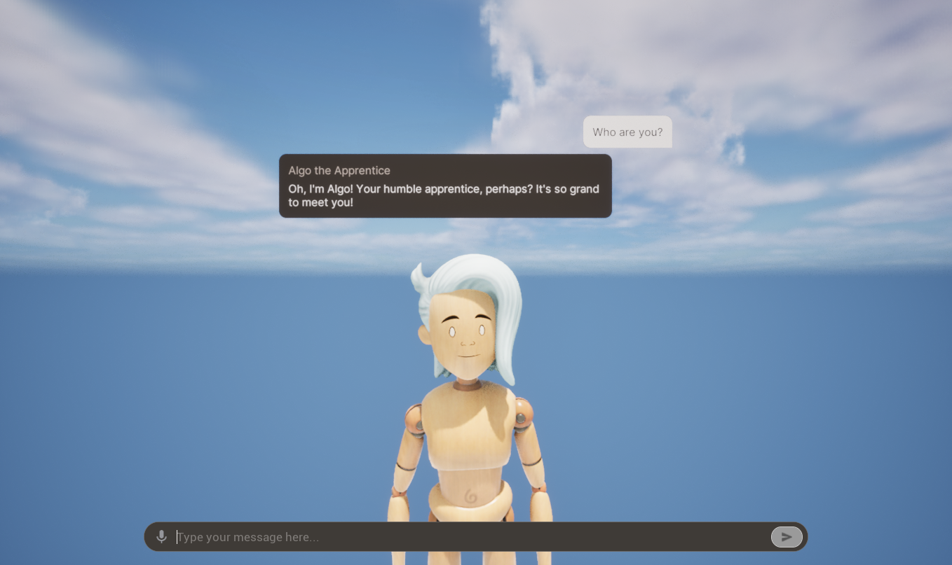 The SingleCharacter level is a simple level that demonstrates a single character interacting with the player.This character is named “Algo the Apprentice”, she is an eager,