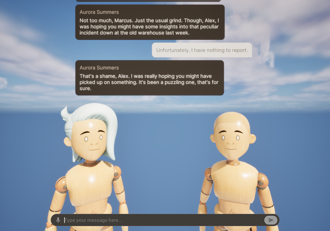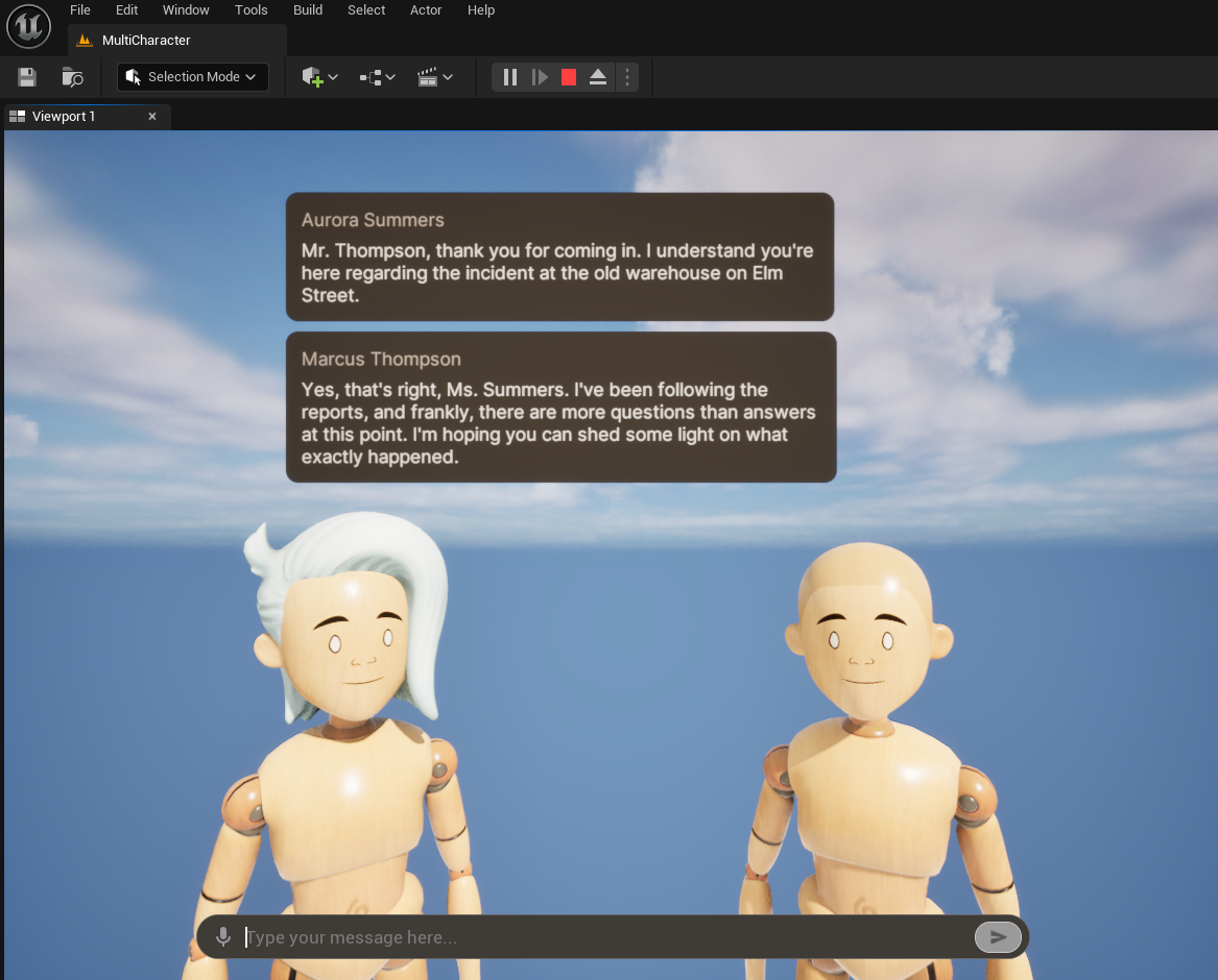 The MultiCharacter level is a more complex level that demonstrates a group of characters conversing and interacting with the player.In this conversation we have:
