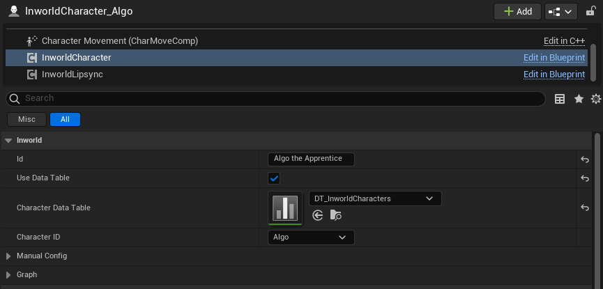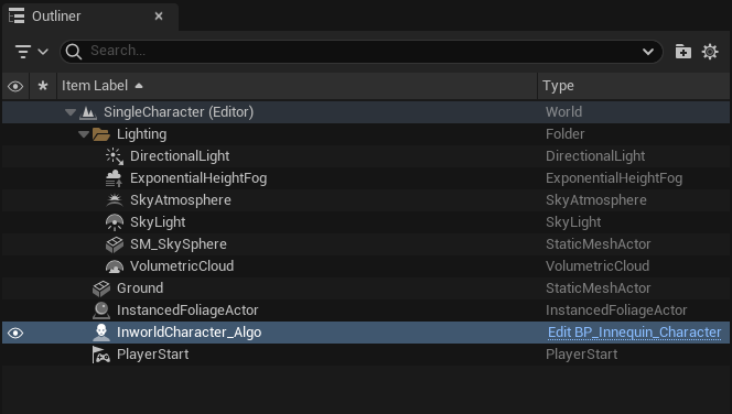 In the SingleCharacter level, the Algo character is represented by a BP_Innequin_Character actor (which inherits from the BP_InworldCharacter3D blueprint from the Character template).