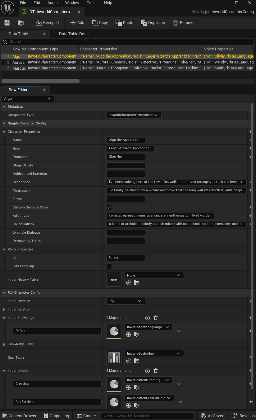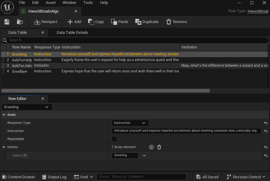Goals allow you to configure predefined character responses and behavior. Intents are sets of phrases used to classify a player’s message intention. Intents can be used to activate goals.