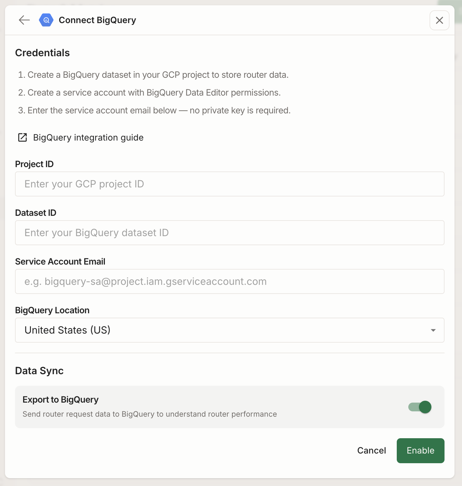 Export router exposure data to your existing BigQuery project for product analytics. When a user is exposed to a router, it is sent as an event to your BigQuery project, including details on router, route, and variant — so you can analyze routing performance directly from BigQuery.Configure the integration in Portal