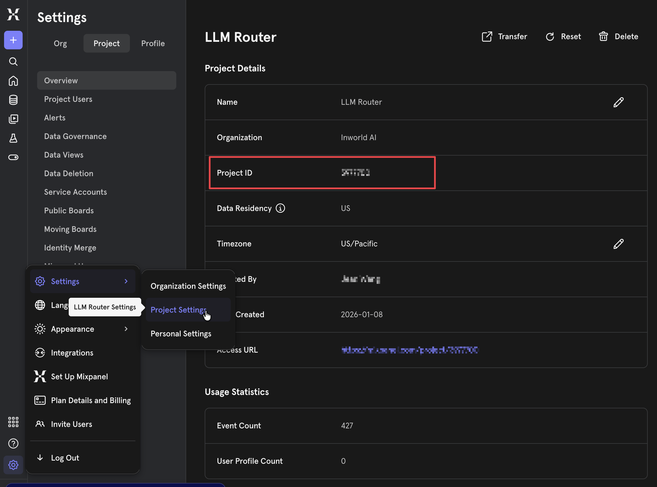 Export router exposure data to your existing Mixpanel project for product analytics. When a user is exposed to a router, it is sent as an event to your Mixpanel project, including details on router, route, and variant — so you can build dashboards and analyze routing performance in Mixpanel.Find your Mixpanel Project ID