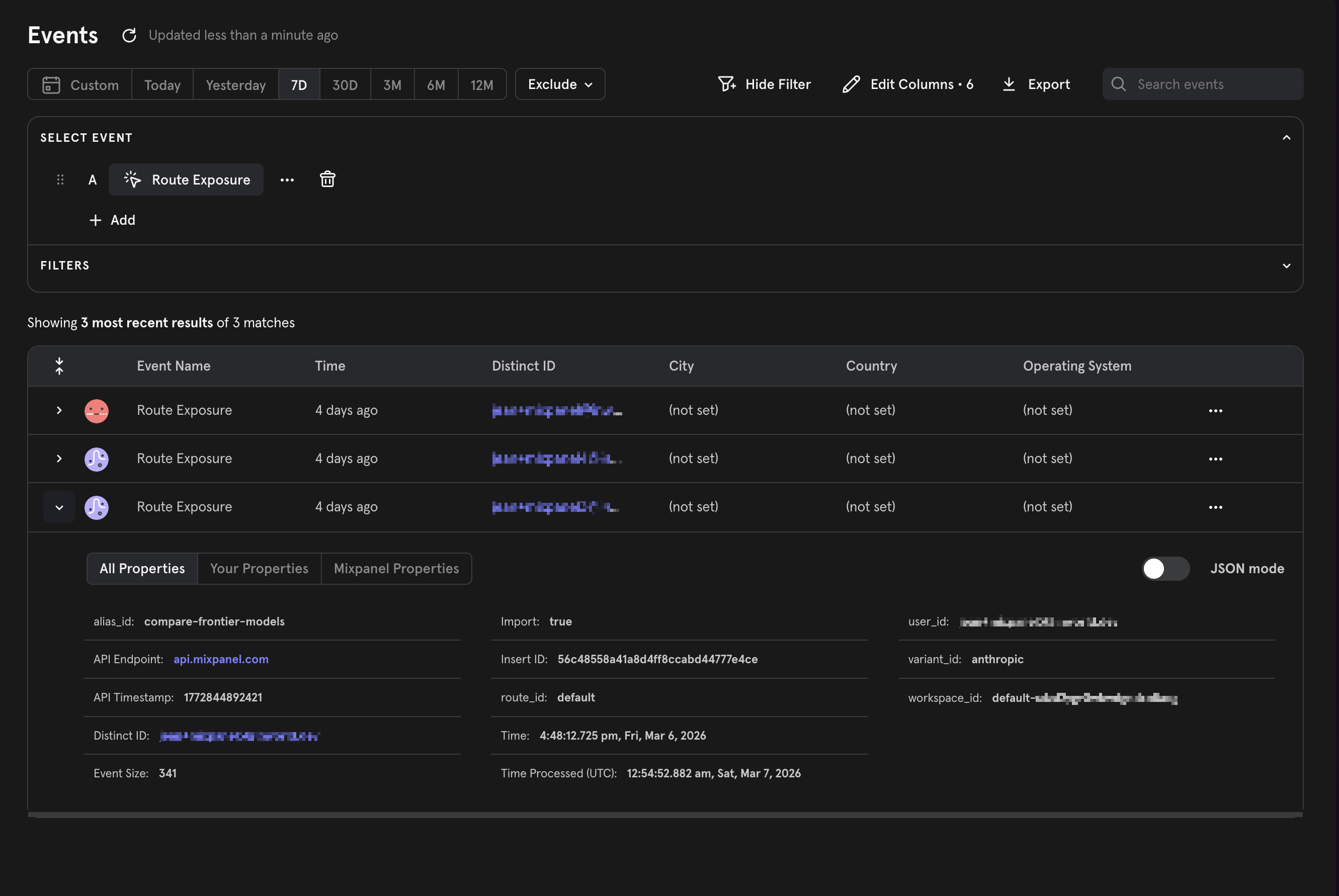 The router exposure data will flow to your Mixpanel project automatically (data will sync every ~8 hours). You will see an event for each router, route, and variant that a user was exposed to every hour.Each event will include: