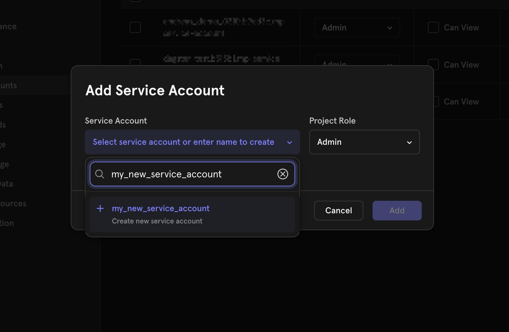 + button to create your new service account. Set the Project Role to Admin or Owner. Set Expires to Never.Click Add and copy the username and secret — you will not be able to view the secret again.Configure the integration in Portal